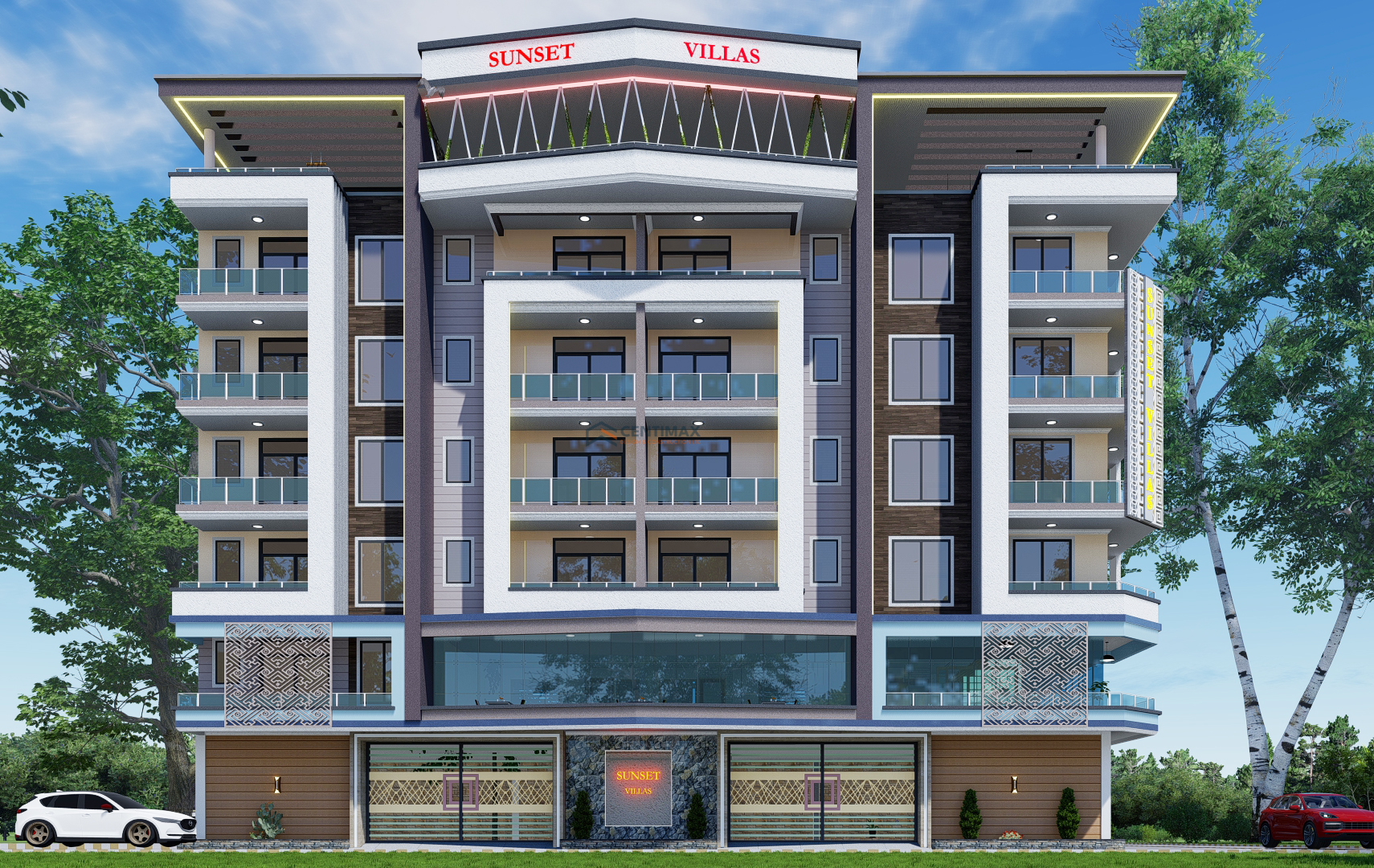 The design language of Sunset Villas focuses on bold geometry and premium material finishes. We utilize a palette of neutral tones, accented by charcoal frames and warm wood-textured panels to create a look that is both sophisticated and inviting.